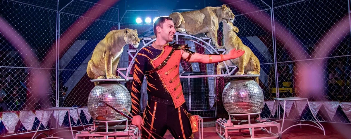 В программе большая группа дрессированных животных – аргентинские попугаи, носухи, индийские дикобразы, дрессированный конь Амур, лемуры, озорные еноты, пушистые кошечки топ мяу и главное Золото нашей программы – грандиозный аттракцион африканских львиц и амурских тигров с бесстрашным дрессировщиком!