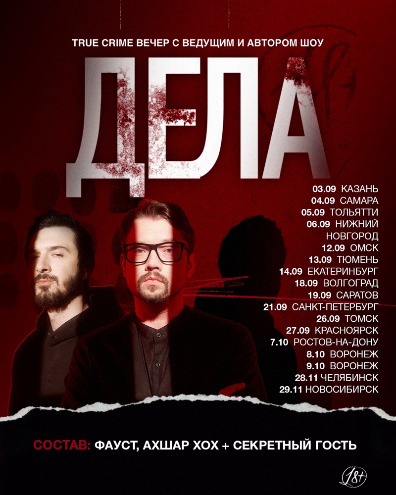 Большой концерт true crime шоу «Дела» — возможность погрузиться в атмосферу криминального подкаста с Василием Бейнаровичем, продюсером Ахшаром Хохом и любимыми гостями. Фауст уже изучает материалы, а автор формата Ахшар вовсю занимается подготовкой тура!
