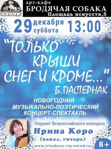 В сезоне 2018 года на сцене АРТ-КАФЕ ПОДВАЛЪ БРОДЯЧЕЙ СОБАКИ Санкт-Петербурга состоится моноспектакль Ирины Коро "Только крышиснег и кроме...", где также будут исполнены известные романсы под аккомпанемент гитары.